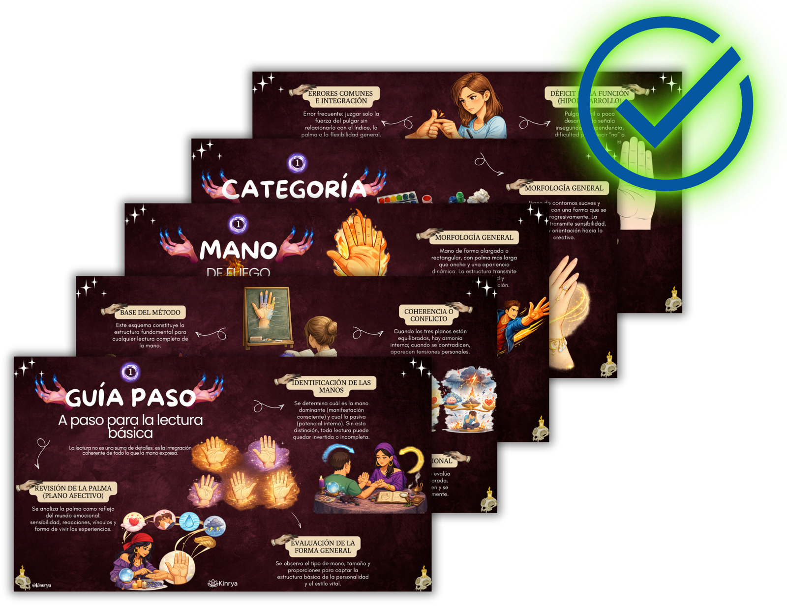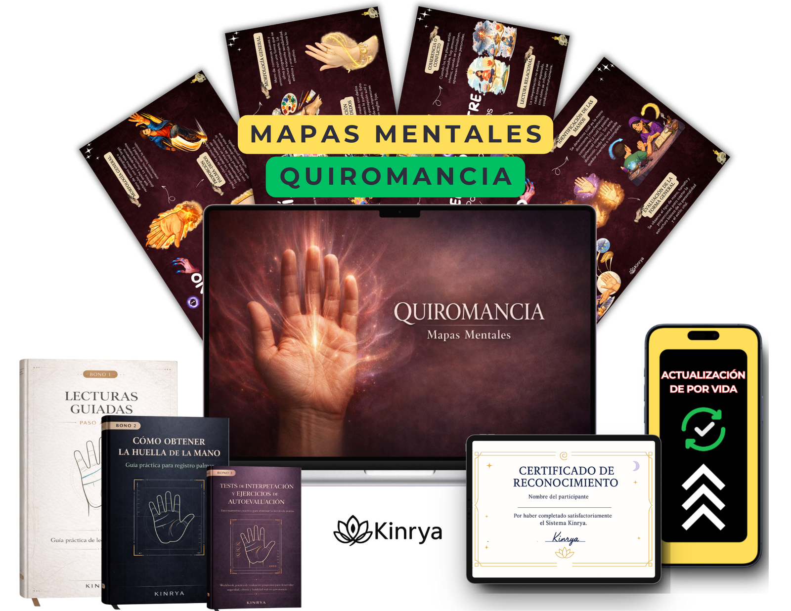 Los materiales ofrecidos bajo el título “Quiromancia: Mapas Mentales”, desarrollados y distribuidos por Kinrya, han sido creados con fines exclusivamente educativos, analíticos y de autoconocimiento.